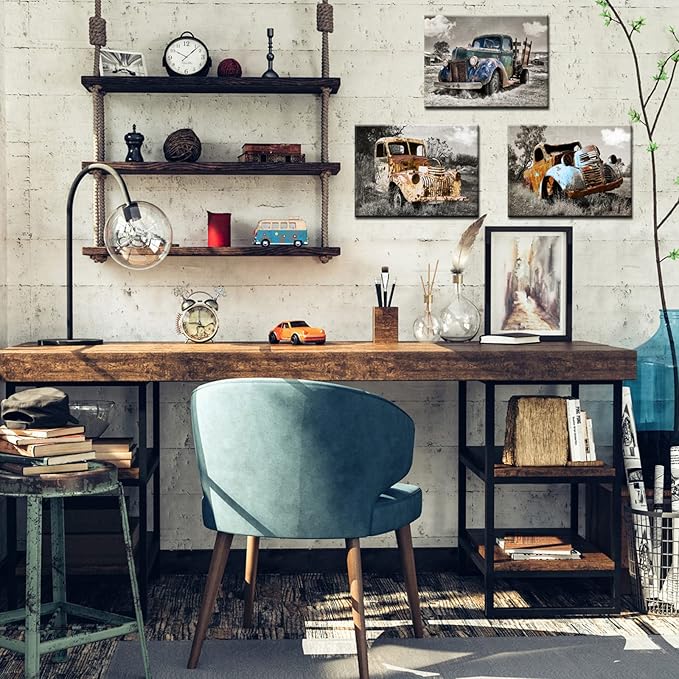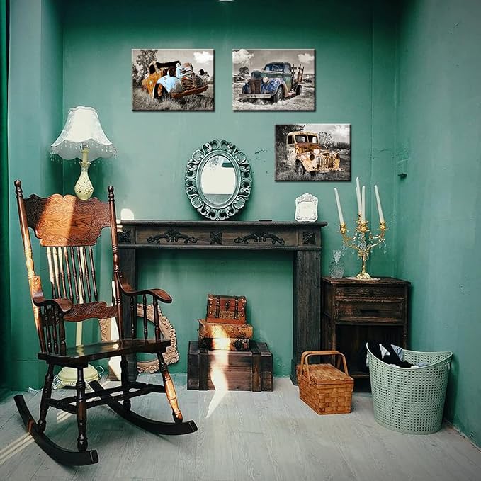 YUANAND Rusty Truck Canvas Wall Art - Vintage Blue Car Pictures Living Room Decor - Country Style Artwork Framed Posters Paintings