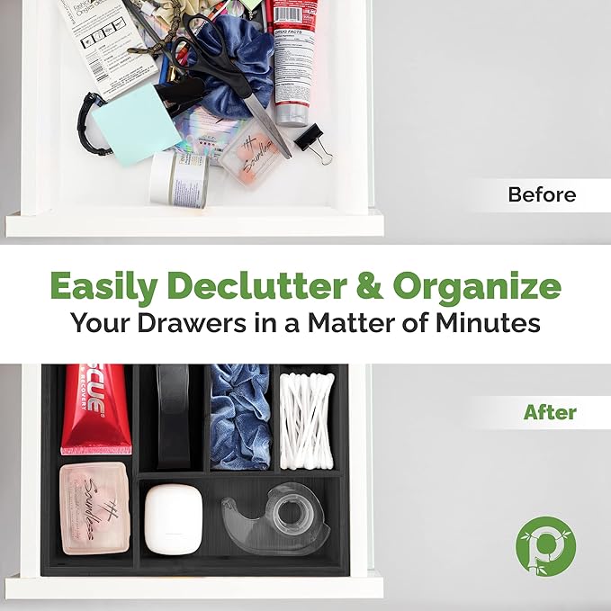 - DESIGNED WITH YOU IN MIND: This sleek and stylish drawer storage organizer is the perfect way to maximize your kitchen space. With 5 different compartments, it can accommodate all those pesky pieces that tend to get lost. The Pristine Bamboo utensil drawer organizer also features an interior depth of 2 inches with the perfect size of 13.5 x 9.8 inches.