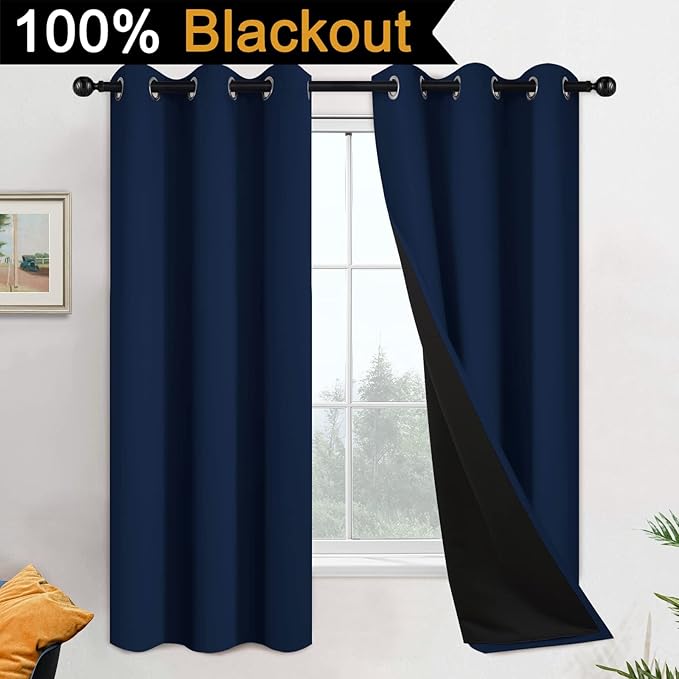 Yakamok 100% Blackout Lined Pair Curtains for Bedroom, Window Treatment Thermal Insulated Soundproof Drapes for Living Room(42Wx63L,Navy Blue, 2 Panels)