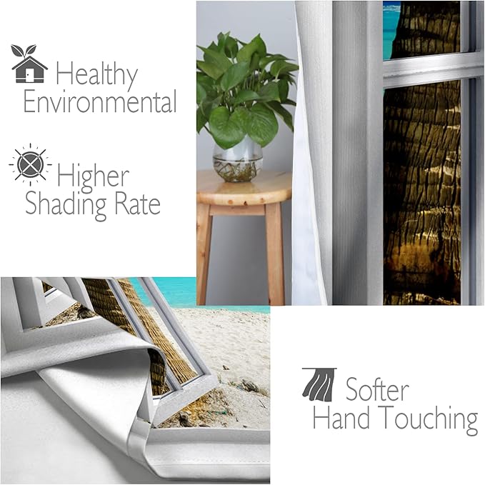 Jekeno Ocean Beach Palm Trees Blackout Curtains Summer Tropical Island Decor for Bedroom Living Room Seaside White Wooden Window View Print Grommet Window Drapes 2 Panel Set, 52"x63"