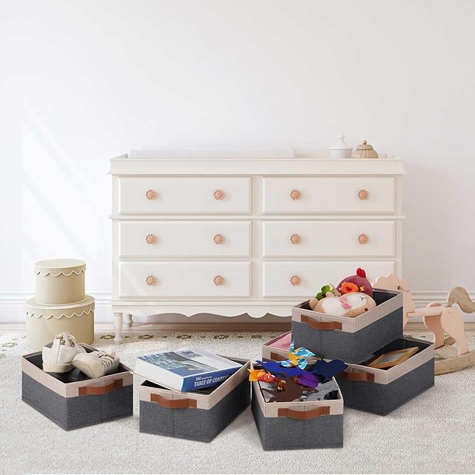 GhvyenntteS Small Fabric Storage Bins 6 Pack, 11.8" x 7.87" x 5.11" Storage Basket with Leather Handles, Closet Storage Bins for Shelves, Storage Baskets for Shelves, DVD Storage (Grey/Beige Yellow)