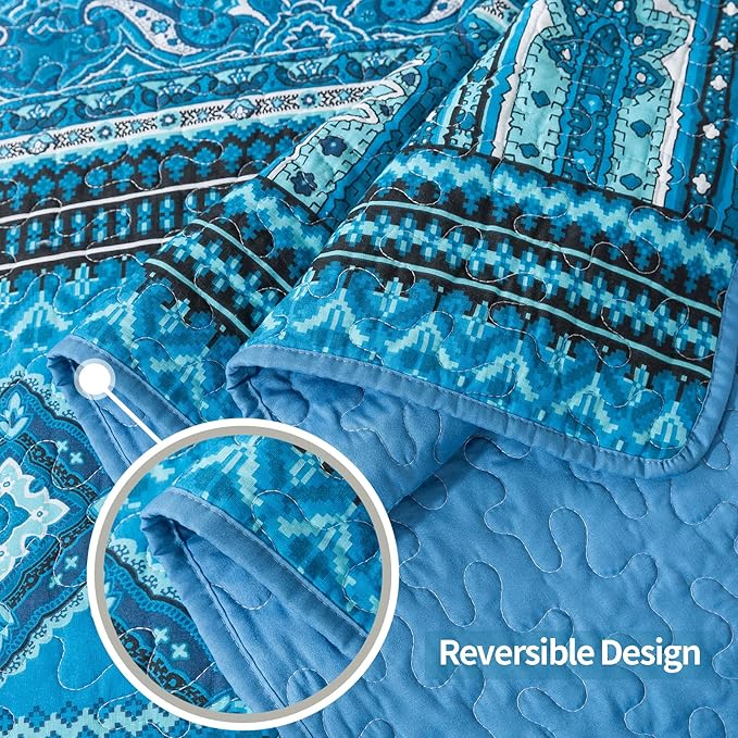 VAPUTAR Cotton Quilt Bedding Set - 3 Pieces, Boho King Size Quilts, Lightweight Reversible Coverlets Bedspreads for Farmhouse Bedroom (Blue)