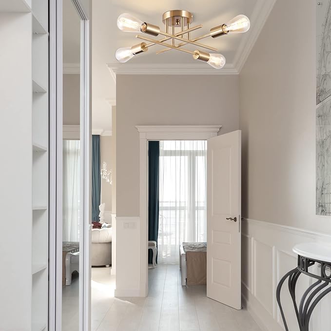 Sputnik Chandeliers, Modern Semi Flush Mount Ceiling Light with E26 Base, Mid Century Industrial Kitchen Farmhouse Light Fixtures for Bedroom Living Room (Brass, Ceiling 4 Lights)