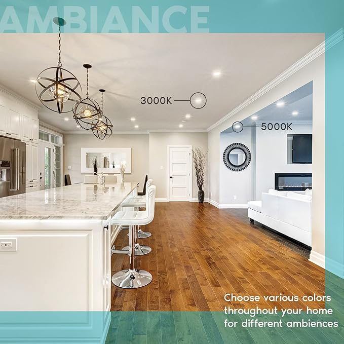 - 5 COLOR OPTIONS - Not sure what recessed lighting color temperature you are looking for in your home? Each LED downlight 6 inch fixture has a simple to use switch connected that can change your lights to 2700K warm white, 3000K soft white, 3500K natural white, 4000K cool white, or 5000K bright white. Your home recessed ceiling lights will be adjustable through 5 color temperatures until you find the perfect light to select for your space.