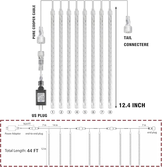 - Dimensions: Each meteor shower rain light consists of 24 tubes, each measuring 30 cm (12 inches) in length, with each tube operating independently. There is a 14-inch string wire between each tube, and each light set includes a 16.4-foot lead wire, providing convenient connection to a power source.
