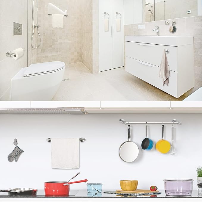 - 【WIDELY USED】-- 24-inch towel rods for bathroom can hang more towels and bath towels, hand towel holder fits small towels. Paper towel holder with stainless steel knob at the bar end can easy to hold the roll paper prevents it from falling off. Hand towel ring can keep cleaning and security, hangs hand towels, fingertip towels next to the sink. Bath robe hook used anywhere such as the bathroom, kitchen, living room.