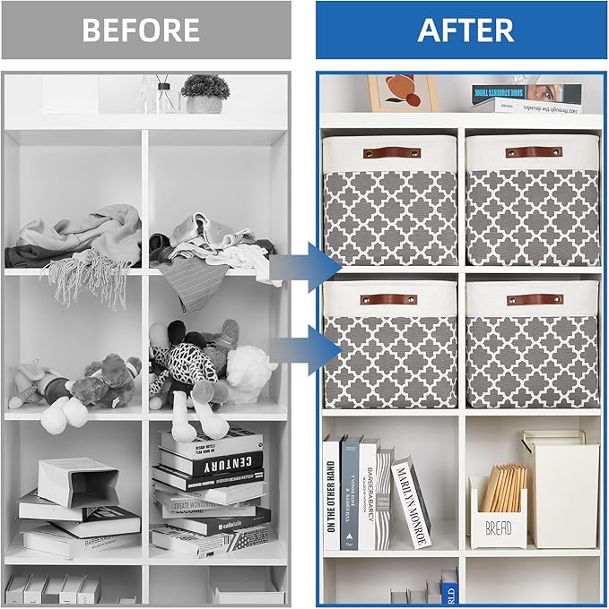 Temary 13×13×13 Foldable Storage Cube Baskets Fabric Cube Storage Basket for Organizing Cloth Storage Bins with Leather Handles for Gifts Empty, Closet (Grey Lattice)