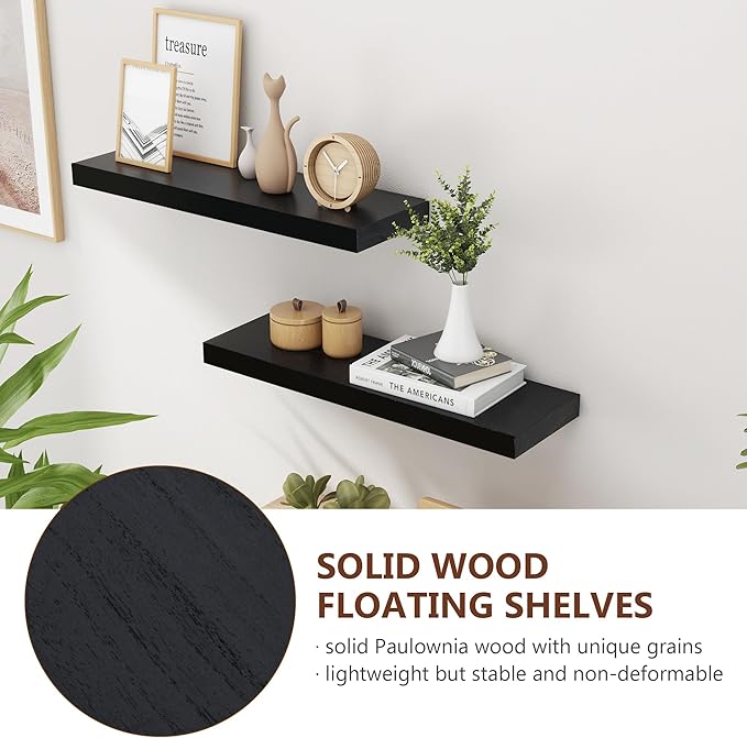 24 Inch Black Floating Shelves for Wall, Solid Wood Wall Shelves Set of 2, Modern Black Shelves Display Ledge Shelves for Bedroom Bathroom Living Room Kitchen Decoration Storage - Black