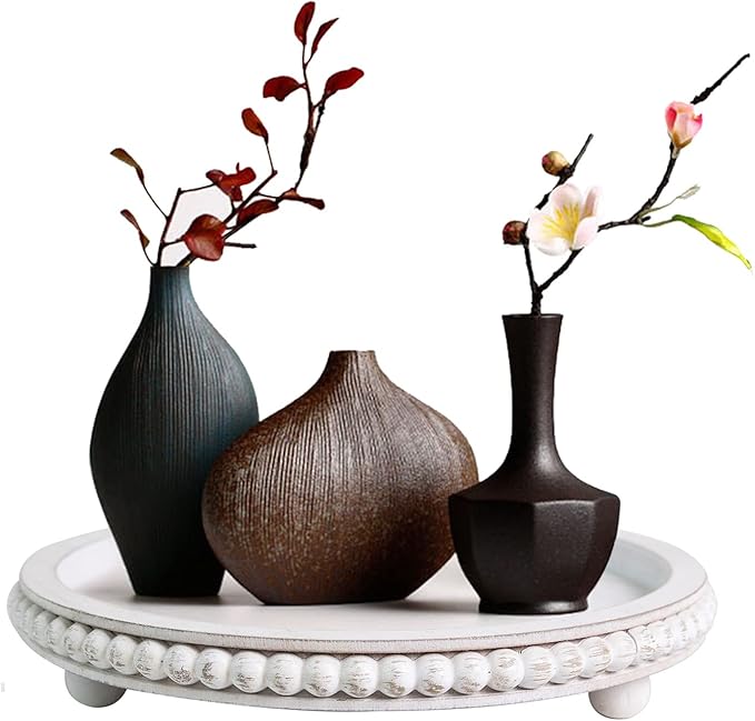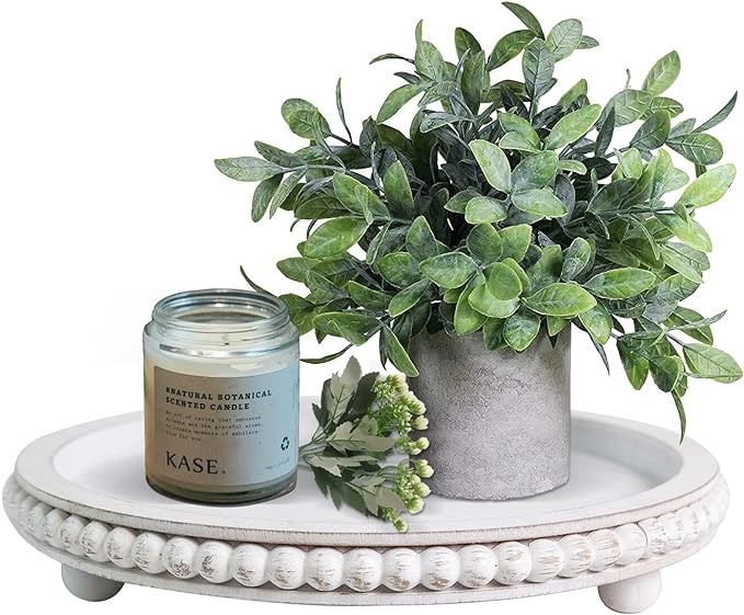 - 【Gorgeous Beaded Tray】:The round beaded tray features special distressed bead accents.Match these items as living room decor, coffee table decor or farmhouse kitchen decor. The decorative tray itself is surely an eye catching and a conversation piece as it comes with unique bead accents around tray.Place it as a centerpiece on your kitchen counter, dining table, entry way table and MORE!