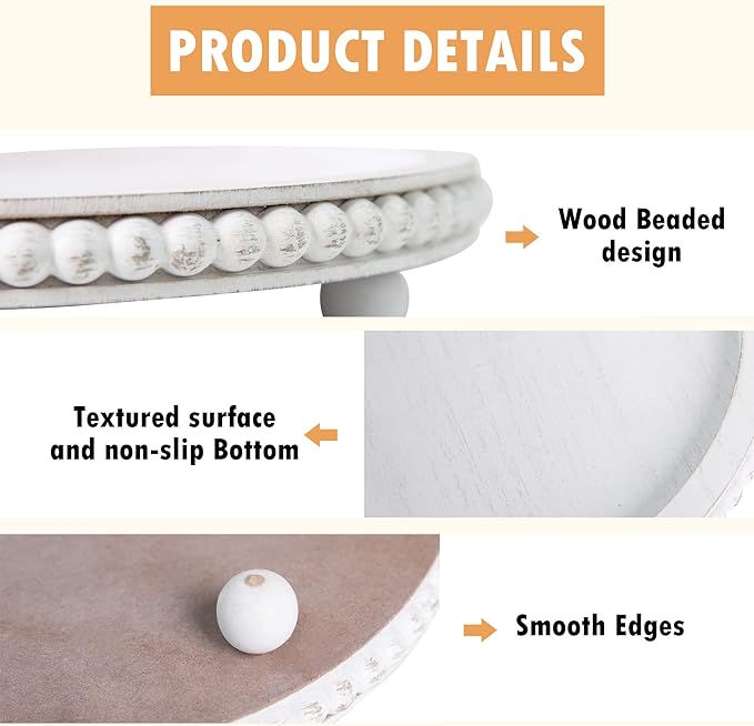 - 【Package Include】: You will receive a 12 inch round wood beaded tray , which has a farmhosue boho style to meet your decoration needs. The total height is about 2.12inch, including 1.12inch ball foot height and 1 inch tray height.