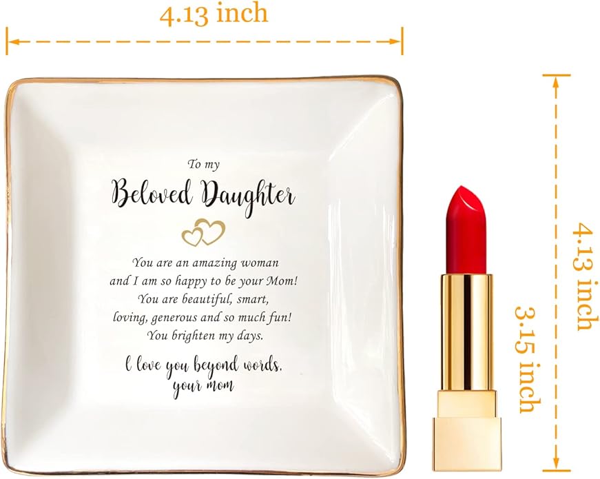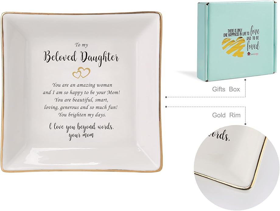 - Sentimental Quote:This daughter’s ring trinket dish has warm words on it - Beloved Daughter, your are an amazing woman, and I am so happy to be your mom! You are beautiful, smart, loving, generous and so much fun! You brighten my days. I love you beyond words, your mom.