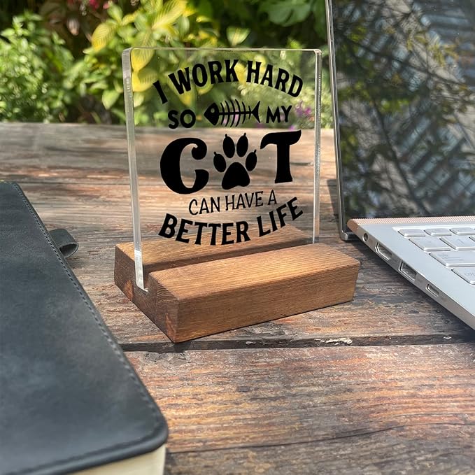 I Work Hard So My Cat Can Have a Better Life Home Office Desk Decor Acrylic Plaque Sign with Wooden Stand Gift for Cat Lover Owner Friend Cowoker Sister Women