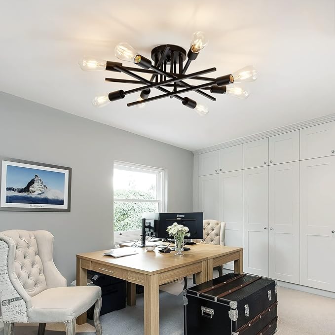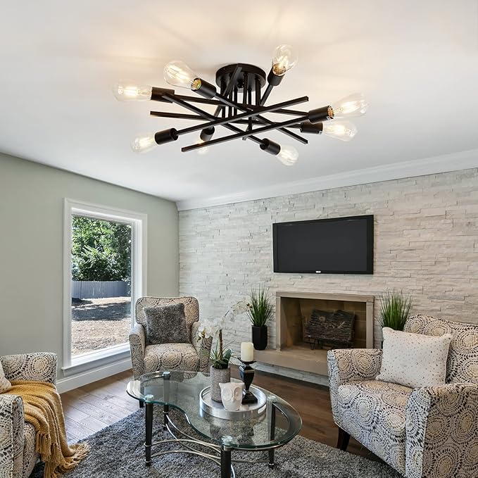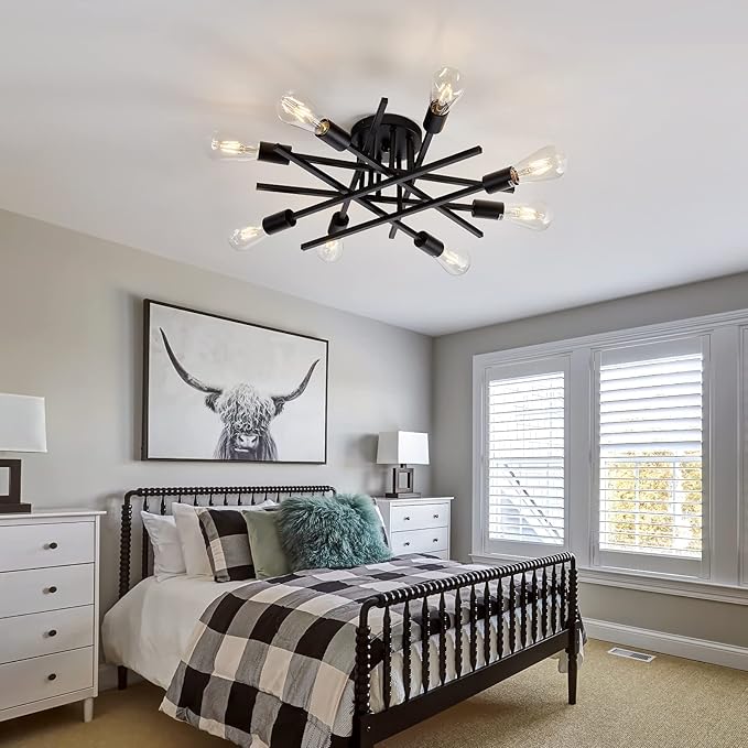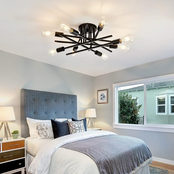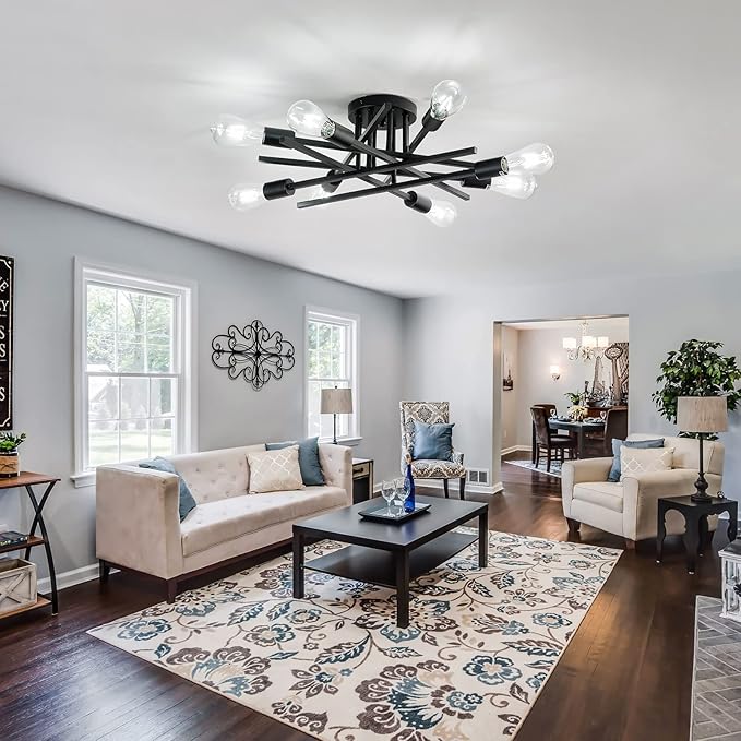 ASGYISA 8-Lights Semi Flush Mount Ceiling Light Fixture,Modern Black Vintage Metal Sputnik Chandelier, Ceiling Lamp for Bedroom Kitchen Dining Room Living Room with E26 Bulb Base