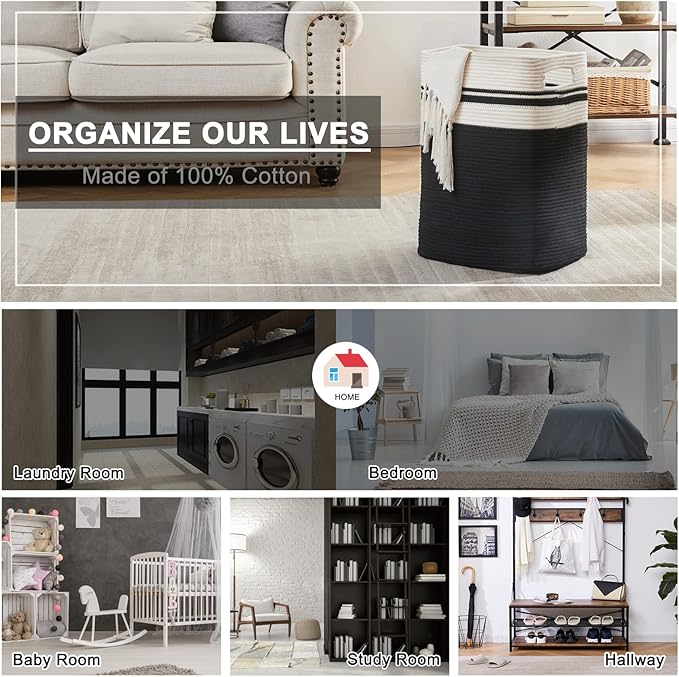 OIAHOMY Laundry Hamper-Laundry Basket,Tall Cotton Storage Basket with Handles,Decorative Blanket Basket for Living room,Collapsible Large Basket for Toys,Pillows,Clothes Organizer-16x13x22in-Black