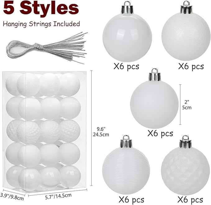- 【Package and Size】These Christmas ornaments balls are 2"/5cm. Pack of 30 balls. Perfect fit for decorating any normal size Christmas trees. Christmas ornaments set with light weight won't weigh down the Christmas tree branches