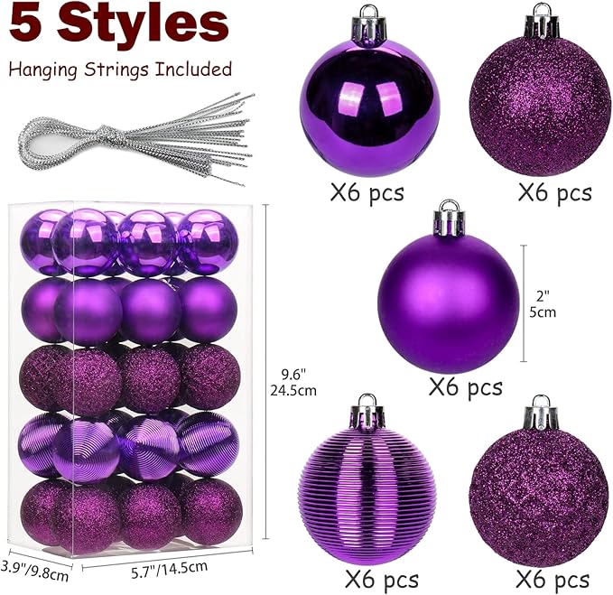 30PCS 2" Christmas Ball Ornaments Shatterproof Purple Christmas Tree Decorations Xmas Tree Balls Halloween Ornaments Décor