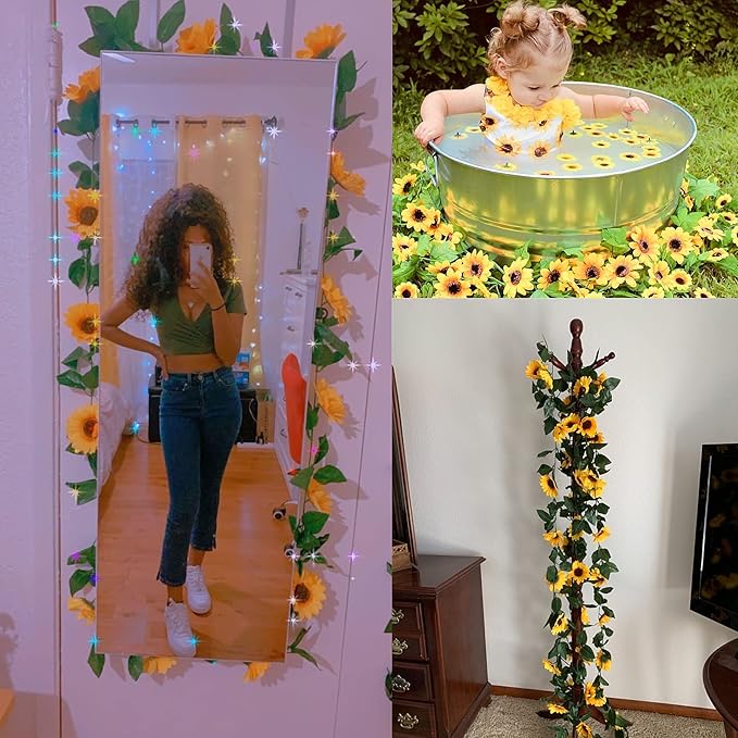 - Package: Include 4 pack artificial sunflower garlands, each vine is about 7 feet long. Lifelike artificial flowers that remain just as fresh-looking and beautiful year after year.