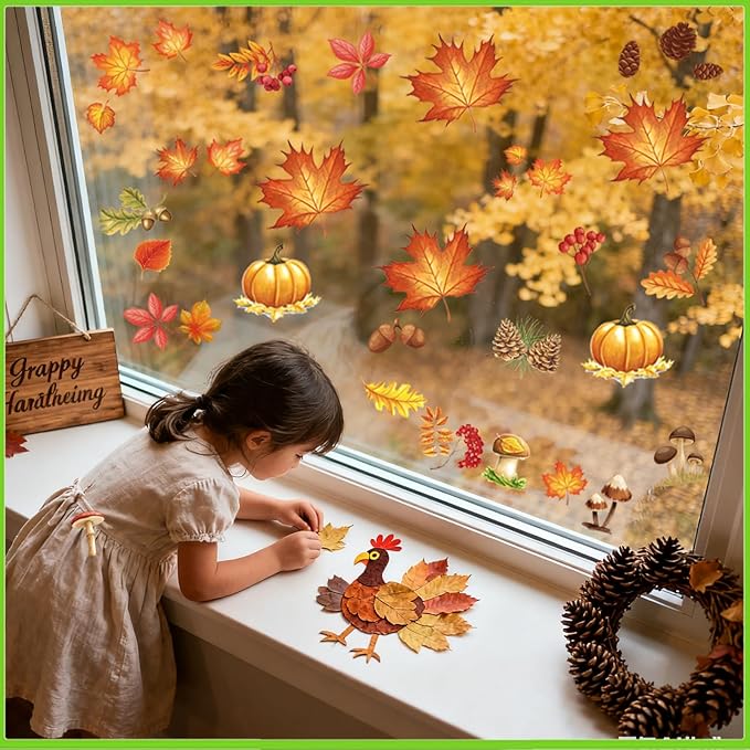 - Fun fall stickers for kids: fall window clings for glass windows, 9 sheets in total, fall decorations for classroom, home indoor, office, bulletin board, wall, bathroom. fall leaves window clings is a great way to create a happy atmosphere.