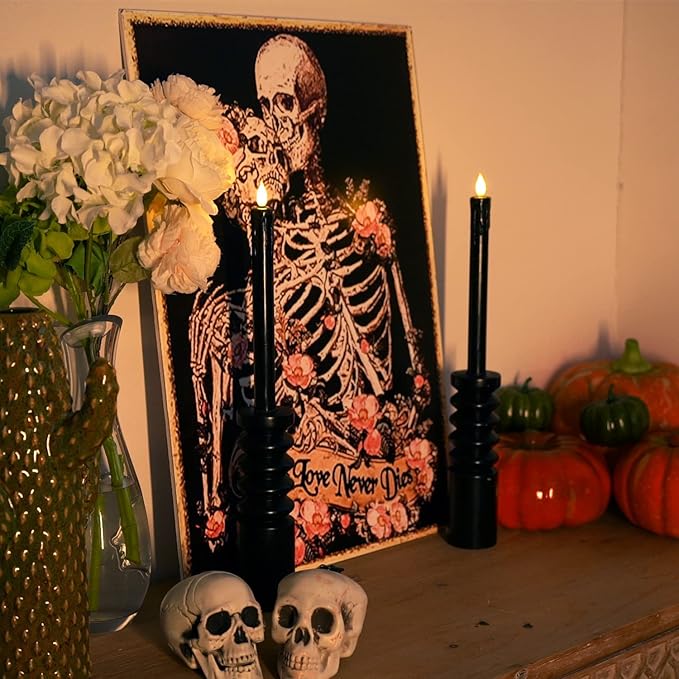 - Real black wax made, melted top design, and smoothly flawlessly finished body, make these flameless taper candles not only a perfect decoration for Halloween haunted but also a classic performer showing noble and elegant. If you are a candle person, this is the must-have set.