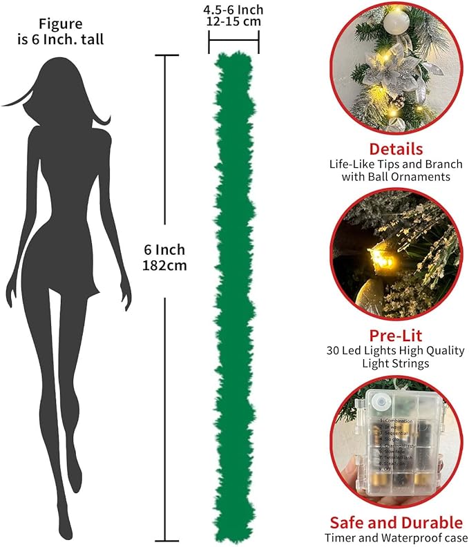 - ③ 【Battery Operated Garland】-Our christmas garland with 30 led lights which is more bright and festival splendid than other 6ft christmas garland.The led lights with 8 variable light modes and timer for 6 hours on, 18 hours off, auto cycle daily with 8 light modes, 3 AA batteries (not included).The operated is IP44 waterproofed so we need not worried about using in the outdoor