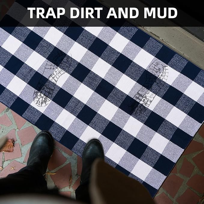 SEEKSEE Cotton Buffalo Plaid Rug 3'x5' Navy Blue and White Checked Rug Washable Doormats Indoor Outdoor Rugs for Layered Front Door Mats, Porch, Kitchen, Farmhouse, Entryway