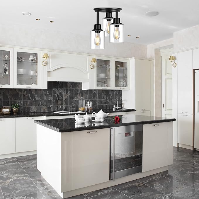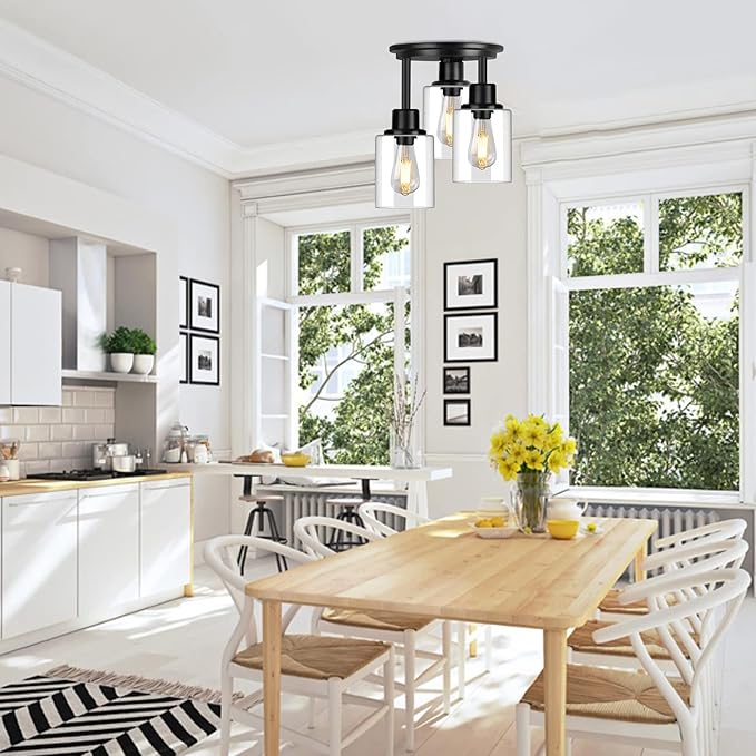 ROTTOGOON Semi Flush Mount Ceiling Light, 3-Light Close to Ceiling Light Fixtures, Matte Black Kitchen Light Fixtures with Clear Glass Shades, Hallway Light Fixtures Ceiling Mount for Foyer Entryway