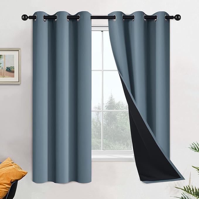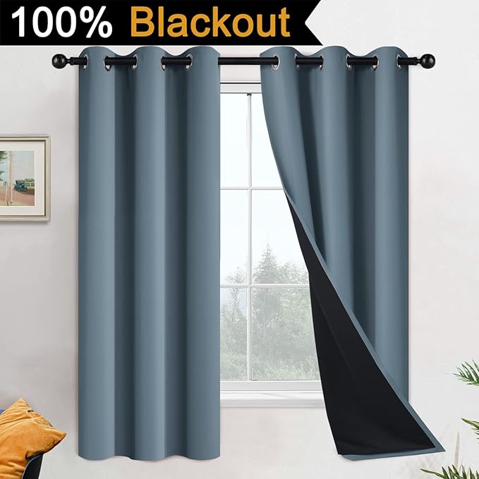 Yakamok 100% Blackout Lined Panels, Thermal Insulated Blackout Curtains for Bedroom, Heat Blocking Drapes for Living Room(42Wx63L, Stone Blue, 2 Panels)