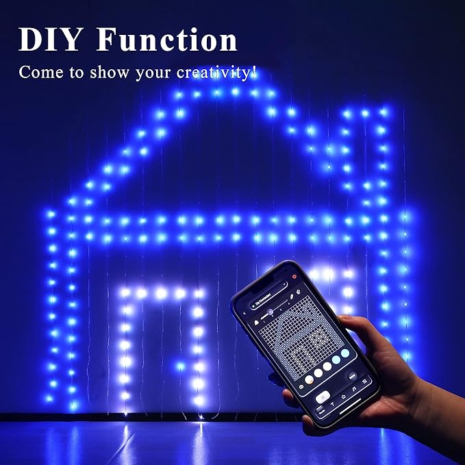 - Multiple light modes and DIY function- The lights have multiple animation options, including pumpkins, skulls, Santa Claus, Deer, Maple Leaf, the American flag, Meteor showers, snows, hearts, and other animations. It can be both daily and festival decorations. There are 12 fixed color and RGB color selection areas on the APP, you can choose colors, draw, or enter text to meet your needs of personalizing and customizing, creating unlimited ideas in the color-changing curtain lights.