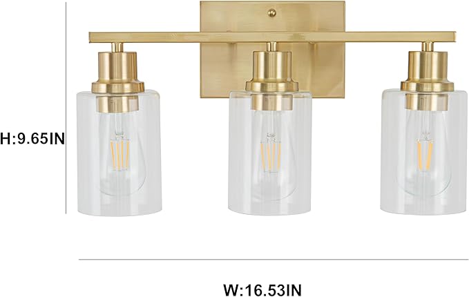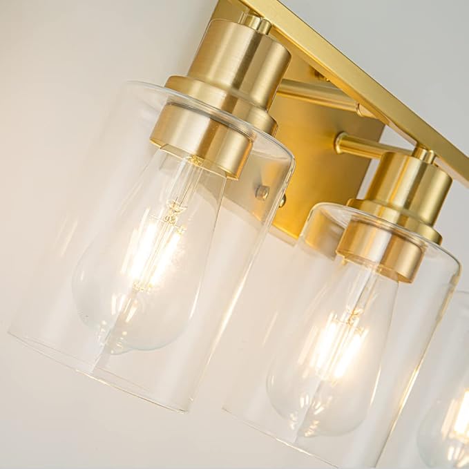 - Superior Durable Material: The 3-light vanity light is made of sturdy metal with a gold finish that won't oxidize or fade. The high quality clear glass shade not only protects the bulb but also enhances the brightness, This wall light can match a variety of styles such as mid-century, Vintage, Industrial, Farmhouse, Minimalist and so on, Adding a classic atmosphere to your space