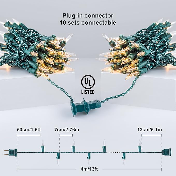 - ๐ฒSafe to Use : 50count warm white Christmas string lights are UL certified and the quality is guaranteed. Our Christmas strings lights have built-in fuses๏ผ which will protect the short circuit caused by the damaged wire and can effectively prevent the possibility of fire. High quality use rest assured. Warm tips: Please kindly protect these string lights from immersing in water and keep the plug dry.