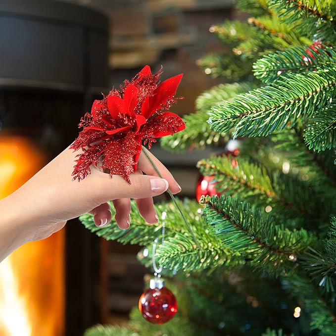 - [ Material ] The Christmas flowers poinsettia ornaments are made of durable cloth and plastic, can be applied to anywhere you want, covered with glitter, which will make the tree more attractive and add more holiday atmosphere! The glitter powder may shed off when it comes. That would not affect exterior looking!