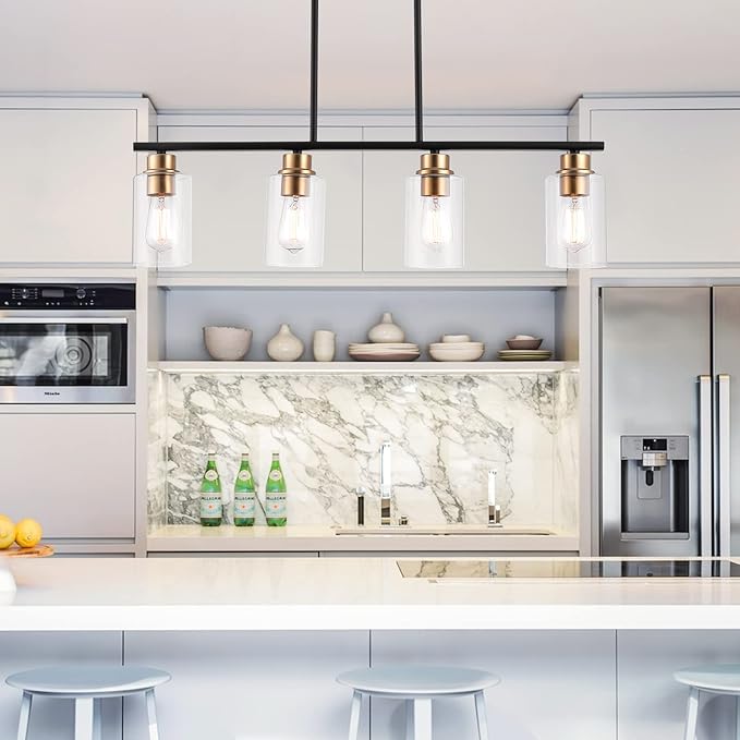 Kitchen Island Light, 4-Light Pendant Lighting, Farmhouse Industrial Dining Room Light Fixtures for Kitchen Island Dining Living Room, Matte Black Gold with Clear Glass Shade