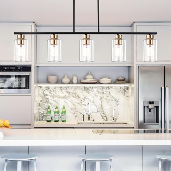 Kitchen Island Light, 5-Light Pendant Lighting, Farmhouse Industrial Dining Room Light Fixtures for Kitchen Island Dining Living Room, Matte Black Gold with Clear Glass Shade