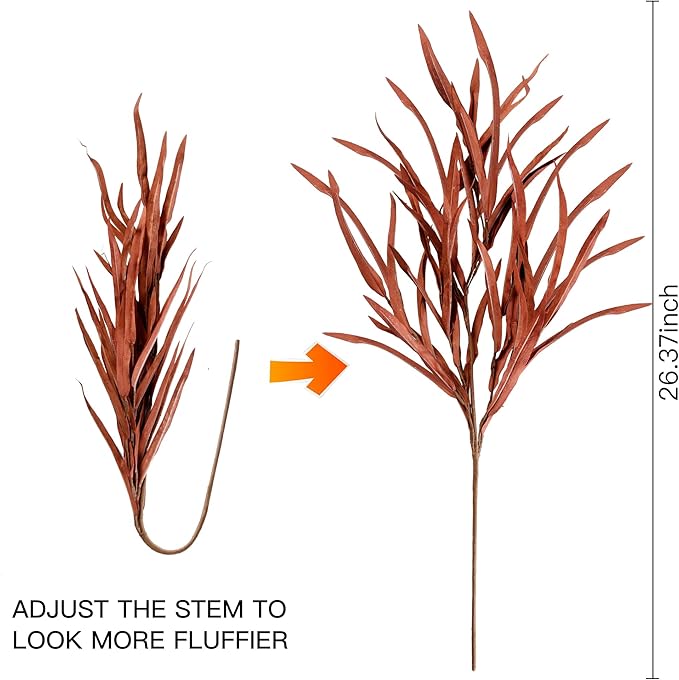 - [SIZE & PACKAGE]: The 6 pieces artificial autumn branches have a total length of 26.37 inch. You can twist them and adjust to the suitable height. Due to the stem is too long, we need to bend the stems for packaging. After you receive it, you can strighten them into original shape easily. Each leave can be disassembled or assembled at will.
