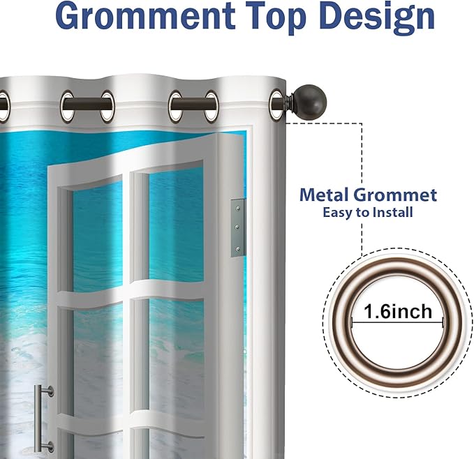 Jekeno Ocean Beach Blackout Curtains Tropical Scene Sea Waves Shell Starfish Conch View Through White Wooden Window Bedroom Living Room Decor Darkening Grommet Window Drapes 2 Panel Set, 42"x54"