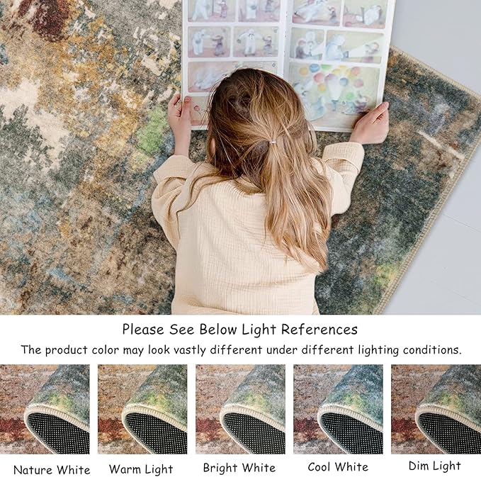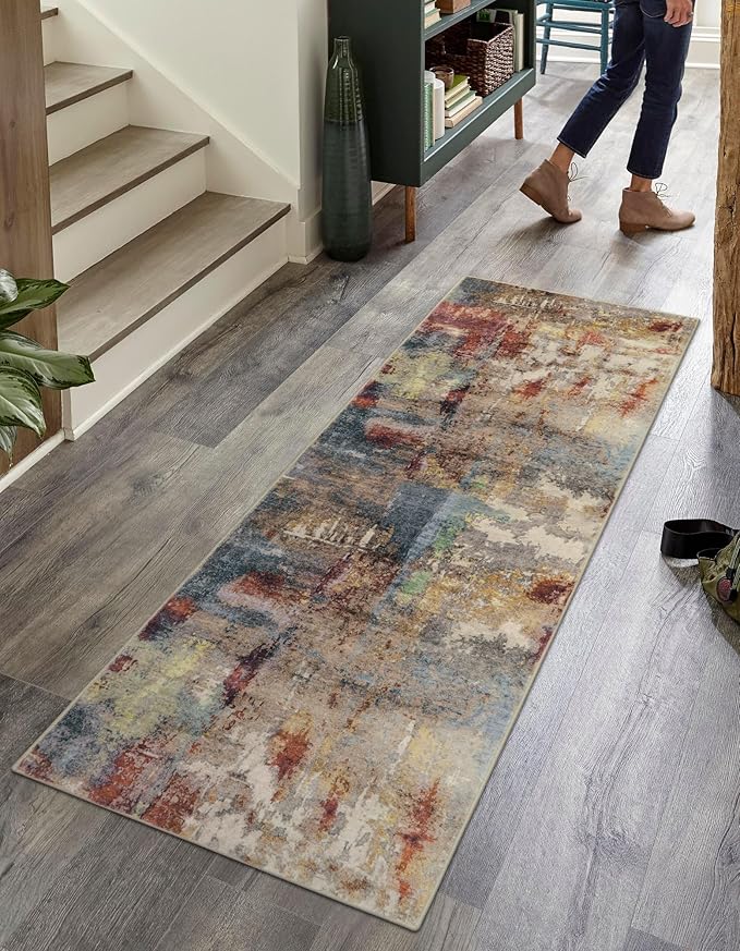 - [Modern Abstract Area Rug] - Add a pop of color to your living room or bedroom with this area rug. Designed with a delicate palette, this collection impresses with an abstract print with splashes of red, blue, yellow, and beige grey hues. Its purposefully faded look fits right in modern industrial and contemporary homes.
