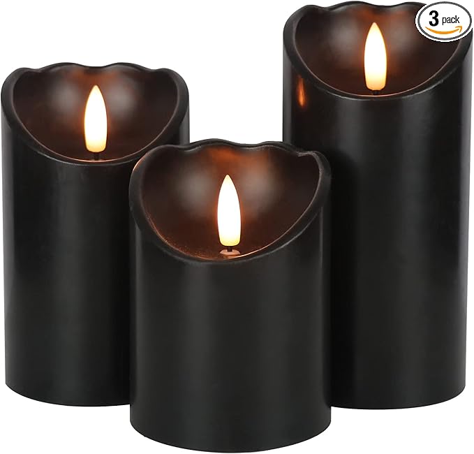 - ❤WHAT YOU WILL GET: You will receive 3 pcs black flameless flickering candles with 3D wick in rough textured finish , each of them operated by 3 AAA batteries(not included). The package includes a 4” pillar, a 5” pillar and a 6” pillar (each 3” diameter)