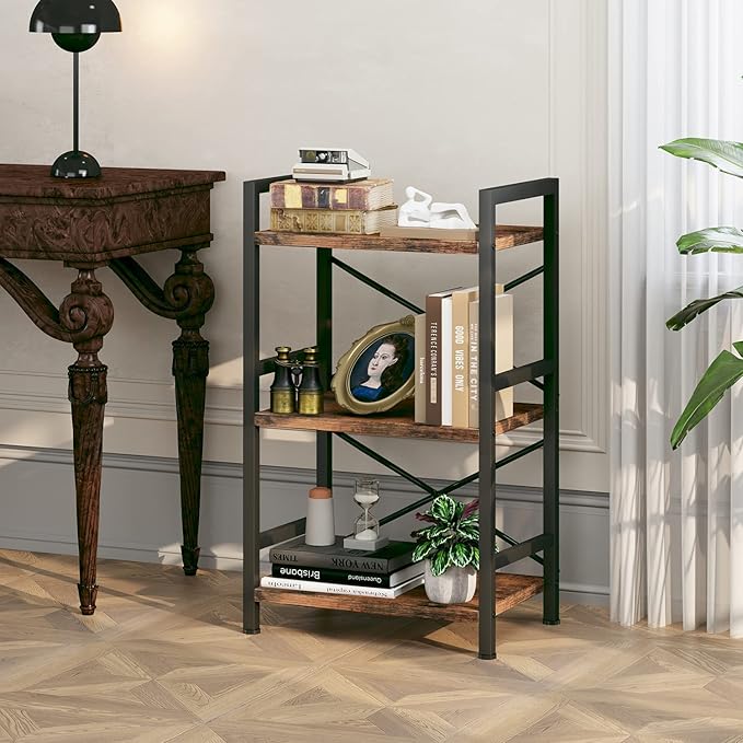 Homeiju Bookshelf, 3 Tier Industrial Bookcase, Metal Small Bookcase, Rustic Etagere Book Shelf Storage Organizer for Living Room, Bedroom, and Home Office(Rustic Brown) Patent Pending D29873033