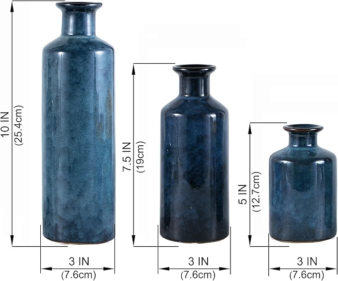 - Dimensions: This 3-piece ceramic vase set with a pefect size, the large vase is 3 x 3 x 10 inch, the middle vase is 3 x 3 x 7.5 inch, the small vase is 3 x 3 x 5.5 inch. These decorative ceramic vase sets for flowers can be used in many different ways.