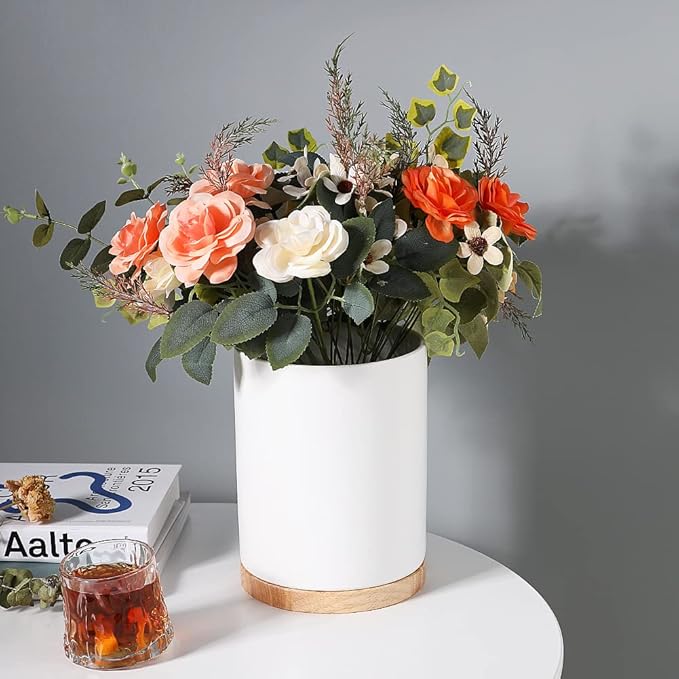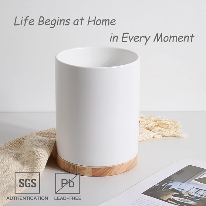 Sweejar Kitchen Utensil Holder with Wooden Bottom, 8.2" Ceramic Utensil Crock to Hold Spatulas for Cooking Countertop, Housewarming, Wedding, Birthday Gift (White)
