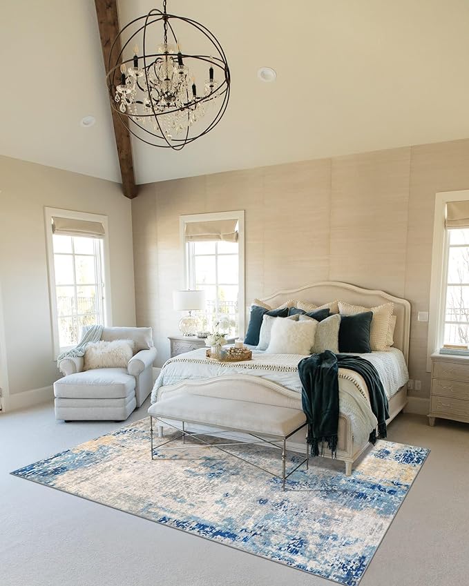 - [Modern Abstract Area Rug] - Add a pop of color to your living room or bedroom with this area rug. Designed with a delicate palette, this collection impresses with an abstract print with splashes of blue, yellow, and beige hues. Its purposefully faded look fits right in modern industrial and contemporary homes.