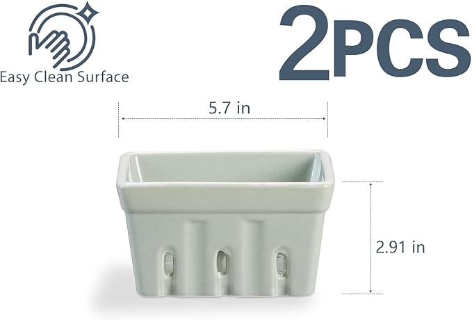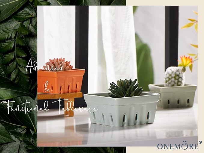 ONEMORE Ceramic Berry Basket, Square Fruit Bowls, Rustic Stoneware Berry Colander Set of 2, 5.7 inch, Gray & Light Green