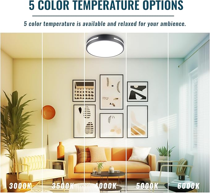 - ๐ใ3000K/3500K/4000K/5000K/6000K Five Color Temperature & Stepless Dimmingใ Wheatronic light fixtures ceiling mount it offers five selectable color temperatures: 3000K (Warm White), 4000K (Neutral White), and 5000K (Daylight White)for different rooms including bedroom, bathroom, kitchen, restroom, laundry room, washrooms, closets, hallway, stairwells, dining room, workshop garage. Additionally, when used with a compatible dimmer (dimmer not included), the light can be easily dimmed from 10% to 100%, allowing you to create the perfect ambiance for any occasion.<br/>