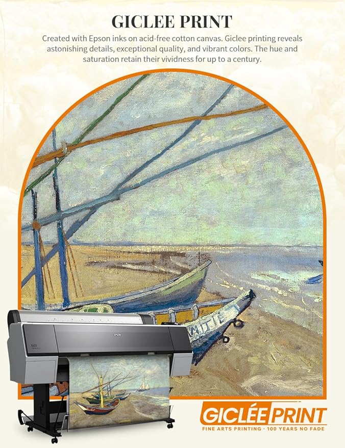 DECORARTS - Boats At Saintes Maire by Vincent Van Gogh Art Reproduction. Oversize Solid Wooden Frame Matching with Giclee Prints Canvas Wall Art. Total framed size: 43x35