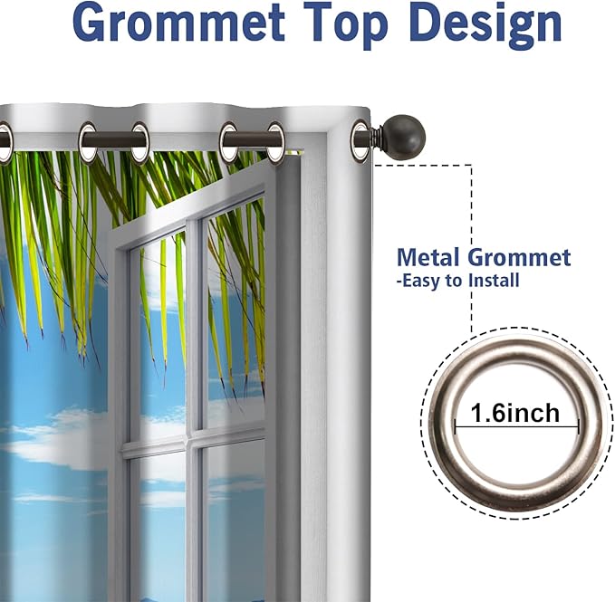 Jekeno Ocean Beach Palm Trees Blackout Curtains Summer Tropical Island Decor Seaside White Wooden Window View Print Grommet Window Drapes for Bedroom Living Room 2 Panel Set, 42"x84"