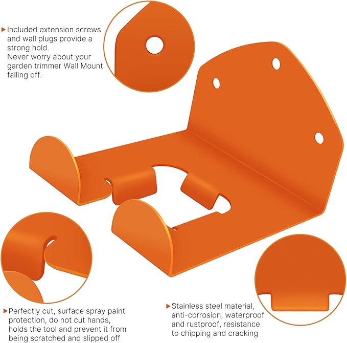 - Sturdy and Premium Materials: The weed eater hanger is made of thickened stainless steel, which is stronger and has high bearing capacity. The surface of the racks is sprayed with orange paint for double protection. Waterproof and anti-rust, resistance to chipping and cracking. Smooth edge cutting does not hurt your hands and tools