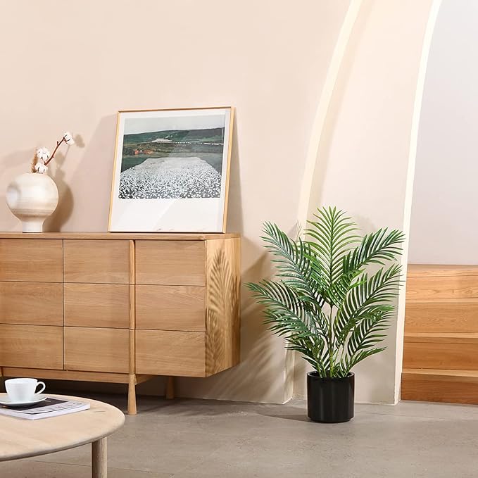 - SIZE- The fake palm plants are about 3 feet from the bottom of the black pot to the top of the tree, and the black plastic pot with 5 inch(H) x 6 inch(W). If you have any question about this 3 FT palm tree, please feel free to contact us