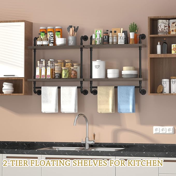 - 【Multi-functional】The 2 tier wood floating shelves are versatile, It can be used as a bathroom towel rack to place bath towel, toilet paper, or display make up things and little decor, also as a kitchen rack to place oil and salt sauce cans and so on, Perfectly saves you space.