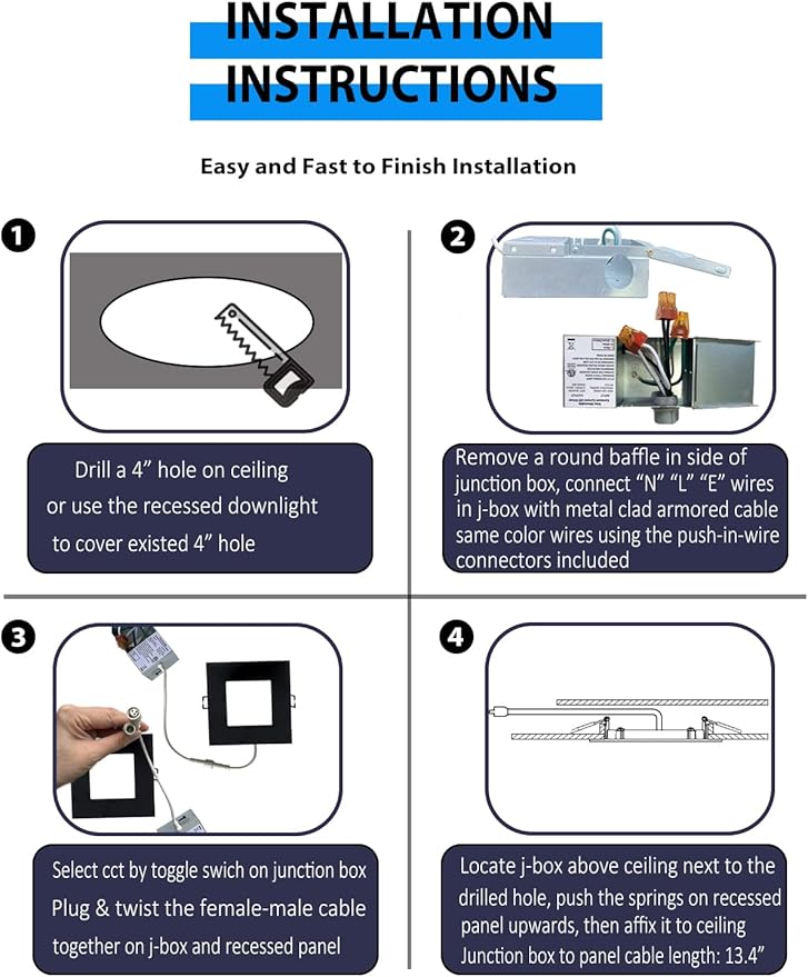 - Super Easy Installation: 4 inch suqare recessed lighting with junction box could be installed directly on the ceiling without housing. Save your time and money