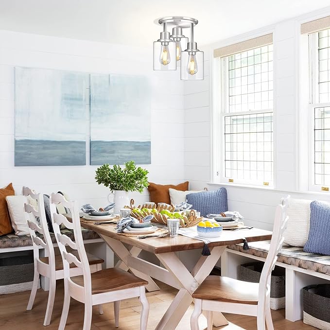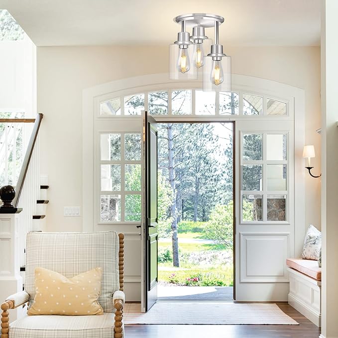 - 【Modern Stylish Design】A design mixed with industrial and contemporary elements which have a brushed nickel finish and clear glass shades. This close to ceiling light fixtures light complements most home decoration styles and is perfect for the kitchen, entrance, hallway, dining room, living room, laundry room, balcony, and more.